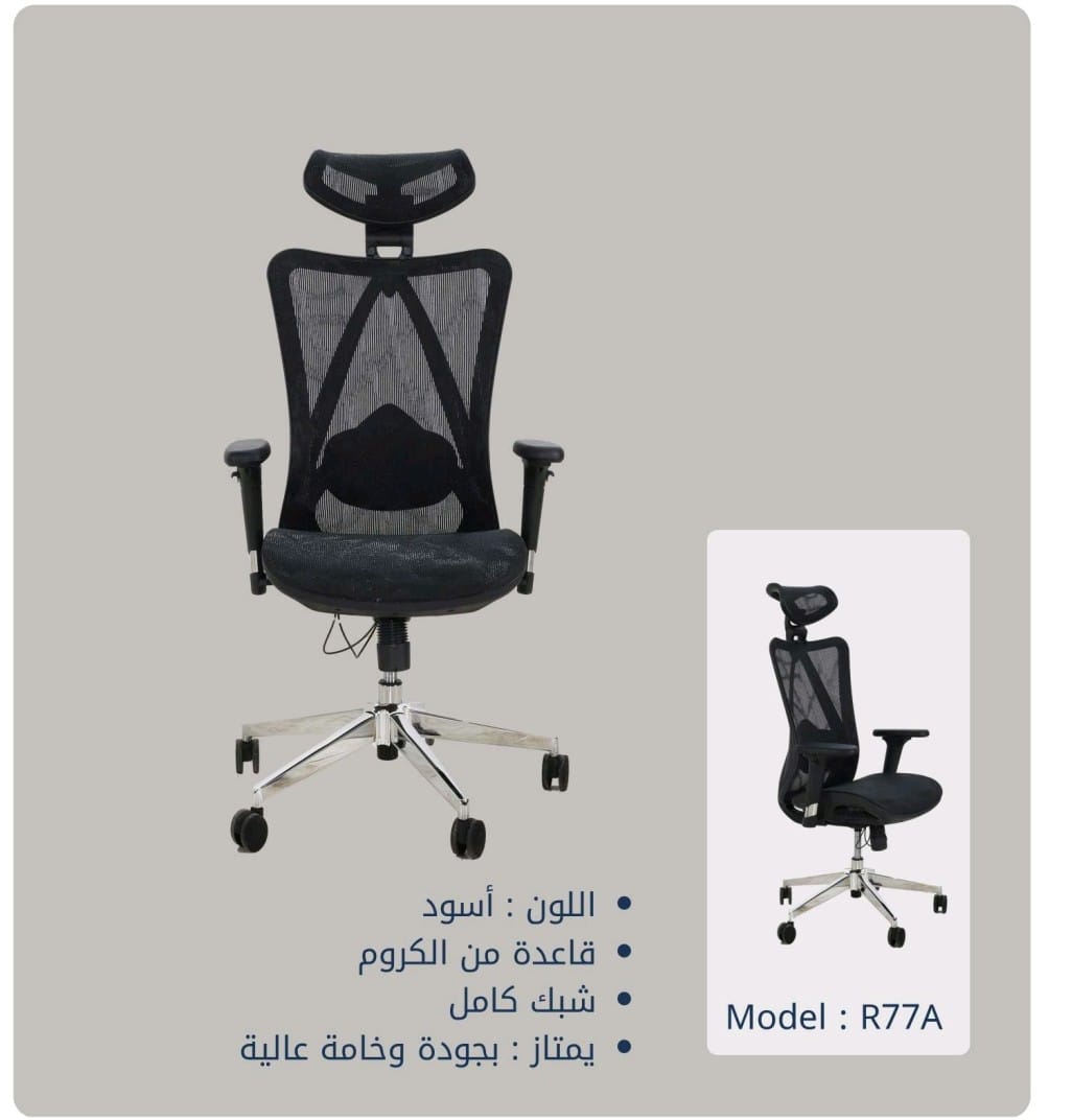 This ergonomic office chair, Model R77A, is designed for superior comfort and support. Its full mesh construction provides excellent breathability, while the robust chrome base ensures stability and durability. This chair is a perfect blend of modern design and functional ergonomics, ideal for long hours at your desk.